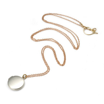 Clean, simple, modern locket. 14kt rose gold 18" chain with satin finished sterling silver locket. Holds two photographs. Locket measures 1/2".
